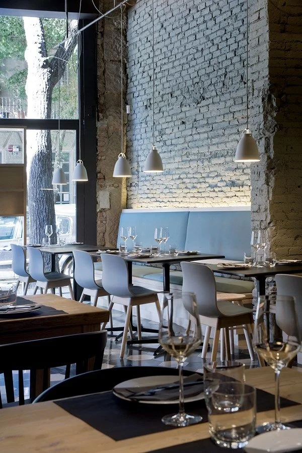 In this restaurant interior, there is a wonderful mixture of a variety of styles and textures. Exposed brick wall, serves as a backdrop for softer lines of furnitures and accessories.