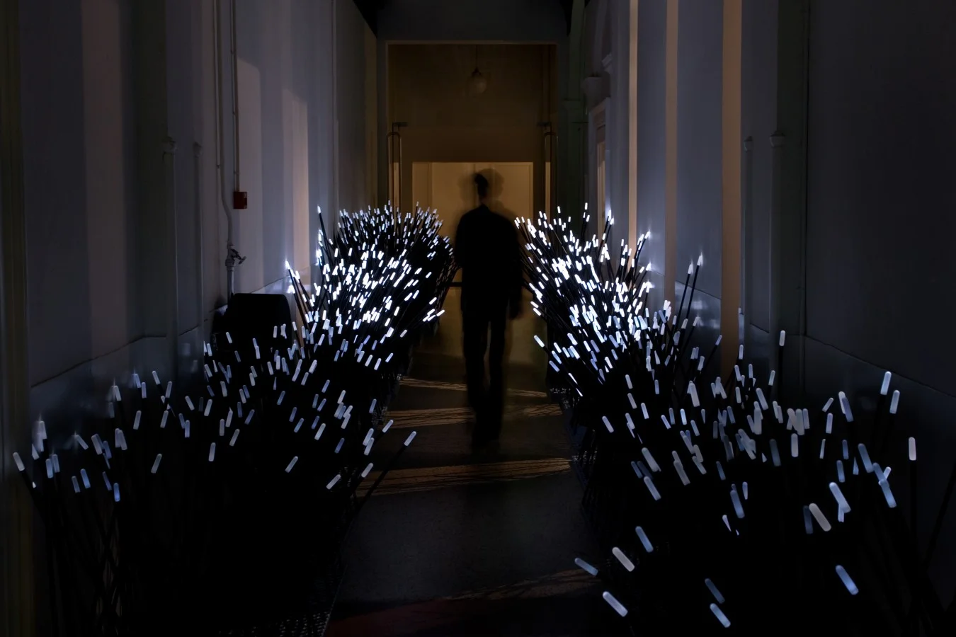 Interactive architecture is a newly emerging branch of architectural design, made possible due to developments in information technology and the availability of new materials that allow extending buildings with information processing, sensing and actuating properties. In opposition to traditional architecture the design essence of interactive architectural objects lies not only in their physicality, but also in their behaviour. Here is one example of an interactive light installation: